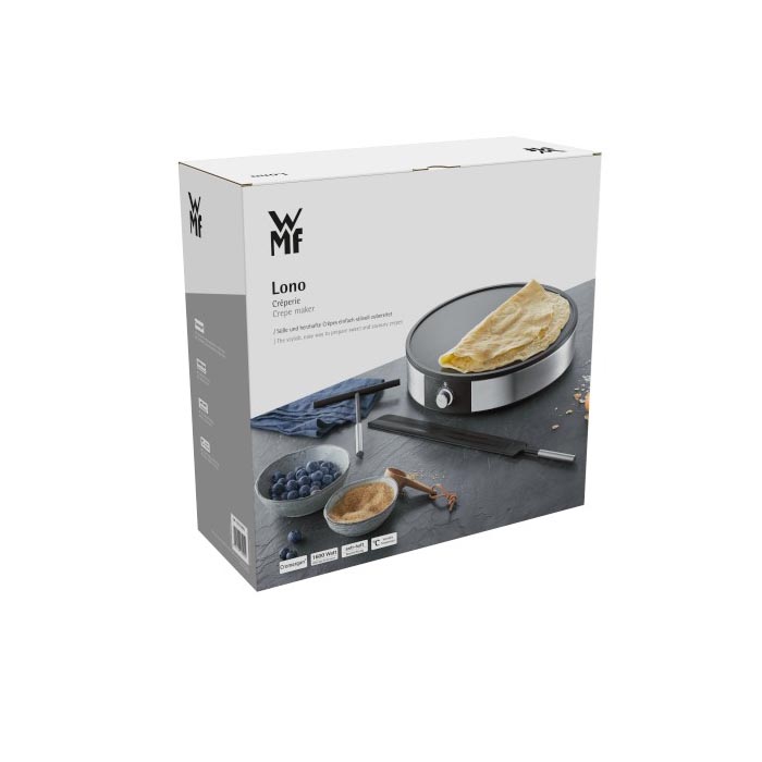 Изящная блинница из нержавеющей стали Cromargan (корпус) с антипригарным покрытием (диаметр 30 см). Более высокий край, чтобы тесто не пролилось. Ручка для настройки температуры с подсветкой. В комплекте: скалка для раскатывания теста и шпатель - из пластика.