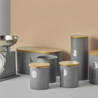 Элегантный, минималистский дизайн. Контейнер для хранения кофе изготовлен из стали с порошковым покрытием серого цвета. Оснащен бамбуковой крышкой (экологически чистая) с силиконовой прокладкой. Стенки украшены табличкой со словом «COFFEE», идентифицирующий содержимое.