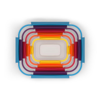 Набор пищевых контейнеров для хранения, например, сыпучих продуктов и жидкостей, для перемещения еды. Изготовлены из пластика без BPA. Каждый имеет герметичную крышку с зажимом и прокладками (ширина 5 мм) - тестировано 10000 раз. Цвет зажимов на крышке соответствует отметке на дне контейнера - удобная идентификация. Возможность вставки контейнеров друг в друга и одинаково крышки - удобство хранения. Контейнеры подходят для холодильников, морозильников, микроволновых печей и посудомоечных машин (на верхней полке).